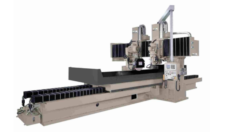 精密龍門磨床主要用砂輪周邊磨削加工大型短寬工件的平面。磨削時工件可直接固定在工作臺面上或電磁吸盤上。龍門磨床采用龍門式布局,包括床身、雙立柱、橫梁組成封閉的剛性框架結構。床身采用雙V型導軌,工作臺導軌面覆有耐磨聚四氟乙烯。拖板沿橫梁導軌作橫向運動,橫向進給由直流電動機驅動,由數控進給。工作臺縱向運動由葉片油泵驅動??蔁o級調速,采用開式液壓系統,液壓油與導軌潤滑有油溫控制裝置。磨頭可沿拖板垂直導軌做上下移動。垂直進給有快速和自動、手動進給兩種方式。磨頭主軸采用套筒式結構和連接式傳動,主軸軸承為高精度向心推力球軸承。